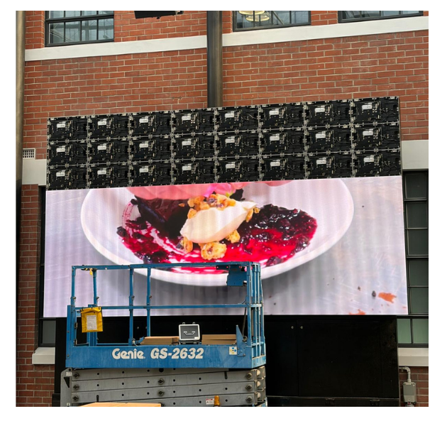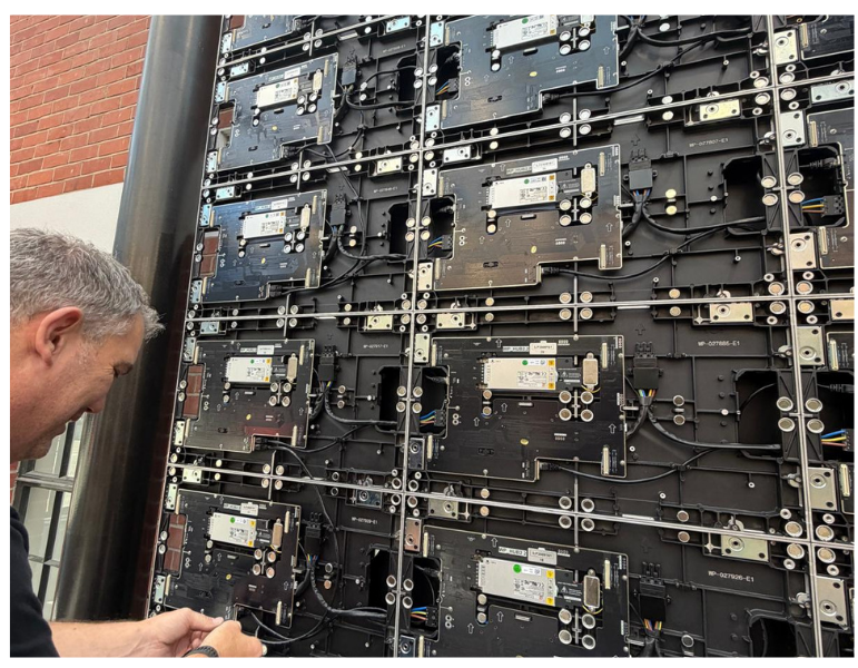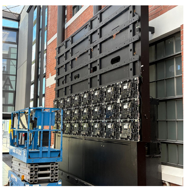 An LED wall of this magnitude isn't just an AV project; it requires serious structural adaptation. The venue previously housed an older, smaller LED display, meaning a foundational framework was already attached to the brick facade. However, to support the massive footprint of the new digital canvas, our team had to custom-fabricate and securely mount the extensions to the existing structure. Because of the sheer height of the installation, our technicians utilized scissor lifts to expand the frame and carefully construct the new wall row-by-row from the bottom up.